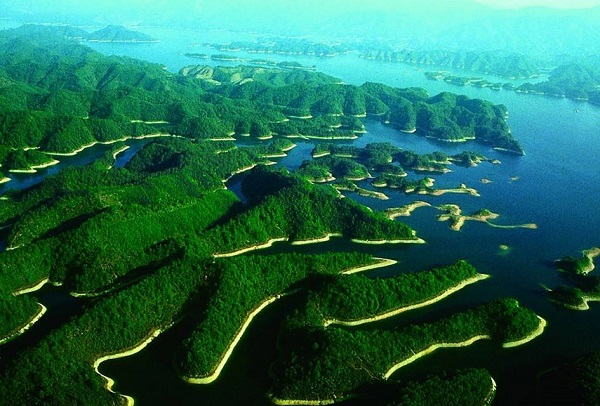 千岛湖(新安江水库),位于浙江省杭州市淳安县境内,小部分连接建德市西北,是为建新安江水电站拦蓄新安江下游而成的人工湖,1955年始建,1960年建成。水库坝高105米,长462米;水库长约150千米,最宽处达10余千米;最深处达100余米,平均水深30.44米,在正常水位情况下,面积约580平方千米,蓄水量可达178亿立方米,在最高水位时拥有1078座大于0.25平方千米的陆桥岛屿,并以2平方千米以下的小岛为主,岛屿面积共409平方千米。
